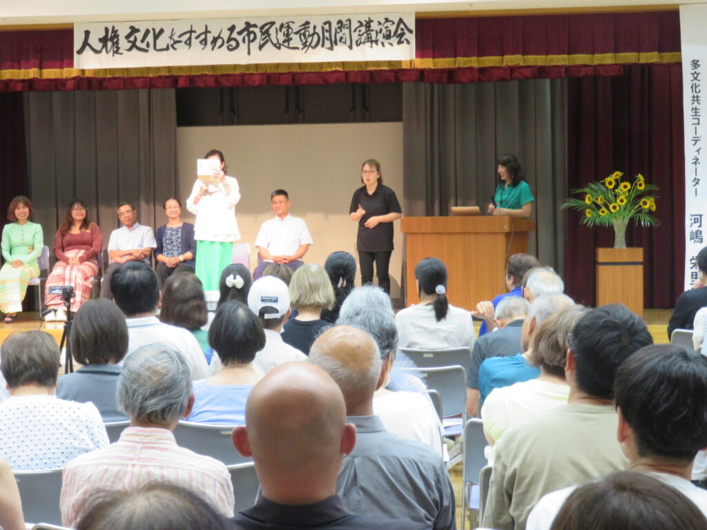 はじめに、西脇小学校5年生、山口さんの「外国人と日本人の差」と題した人権作文の朗読を聴きました。英語の先生に何げなくした質問をきっかけに、普段の自分の言葉のなかに相手を傷つける言葉がないかを振り返っていました。その視点は、参加された皆さんの新たな気づきとなっていました。
