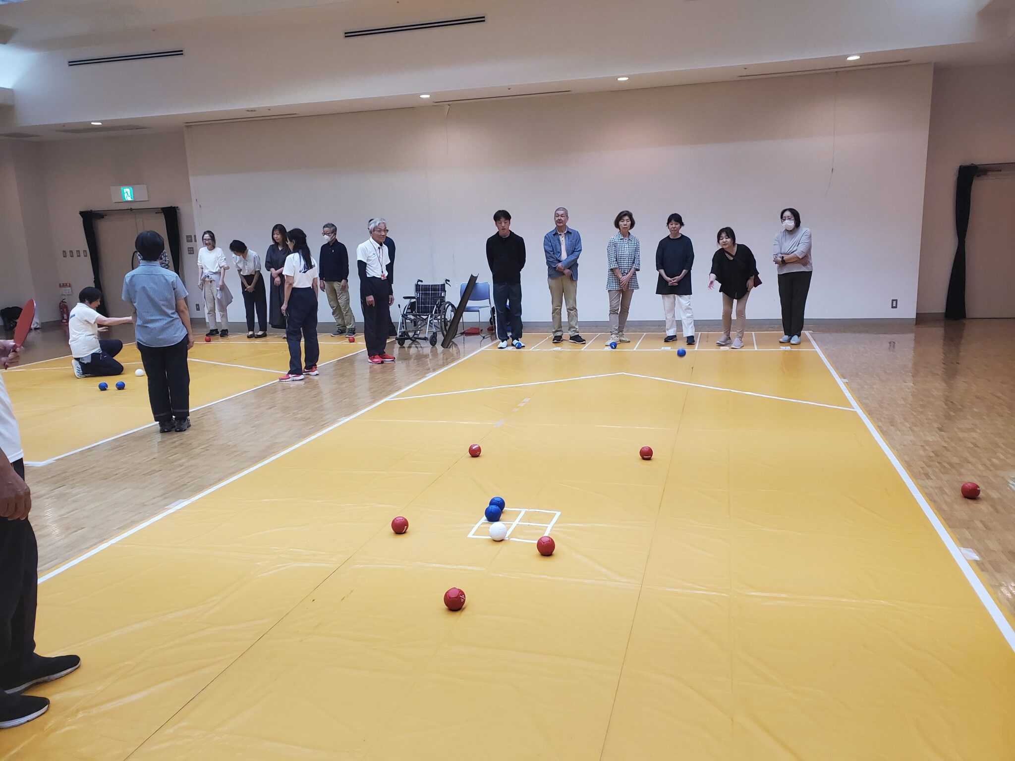 今回の研修では、西脇市スポーツ推進委員のみなさんに来ていただき、ボッチャを体験しました。ボッチャは年齢や障害の有無に関わらず、だれでも楽しめるスポーツです。赤と青のボールを交互に投げたり転がしたりして、白い目標球(ジャックボール)にどれだけ近づけられるかを競います。