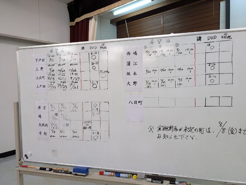 ・9月から津万地区内13町で始まる町別人権学習会の開催に向けて、各町の推進員さんに加えて区長様も参加いただき、学習会の計画を町ごとに相談していただきました。